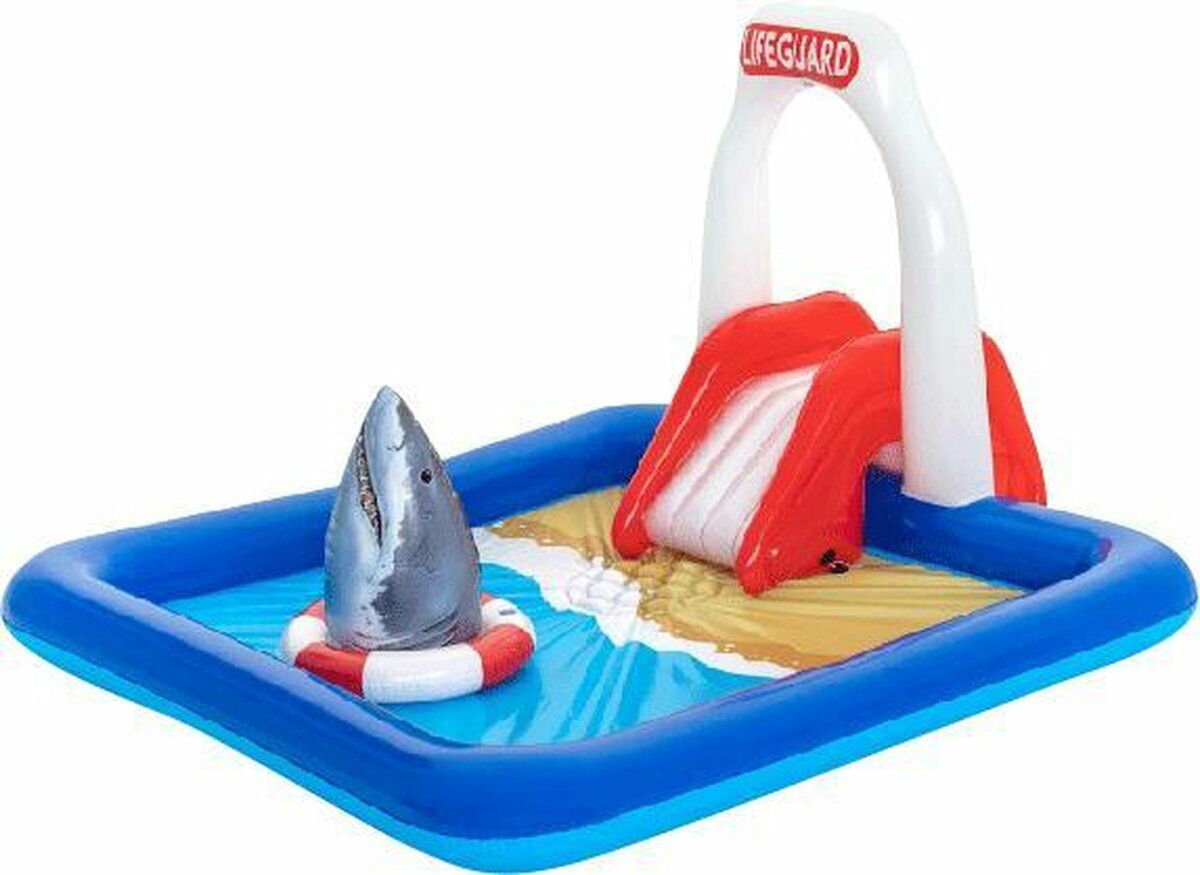 Dit leuke play center van Bestway heeft een afmeting van 234x203x129 cm en past hierdoor in vrijwel iedere tuin. Het zwembad is snel opgeblazen en bestaat uit meerdere luchtkamers die zorgen voor extra stabiliteit van het play center Lifeguard. Nadat het play center opgeblazen is kan je het zwembad vol laten lopen met water. Wanneer het zwembad vol genoeg is kan je de tuinslang aansluiten op het zwembad. Hierdoor krijg je een verkoelende douche boven de glijbaan. Dit water zorgt er tevens voor dat je soepel van de glijbaan afglijdt. De opblaasbare haai drijft op het water en kan je dus ook los gebruiken.